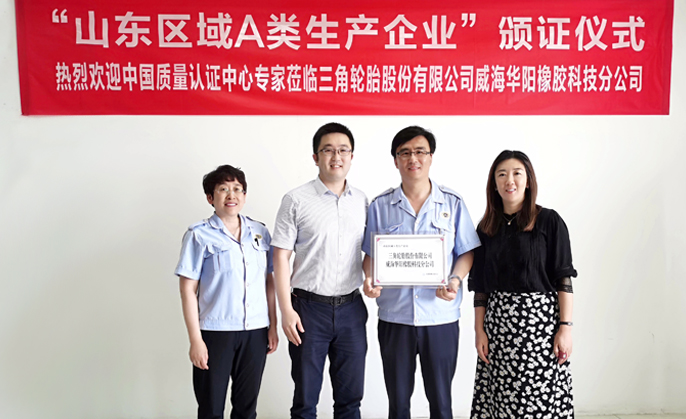 6月16日,中国质量认证中心青岛分中心为三角轮胎华阳分公司颁发了“山东区域A类生产企业”证书。
