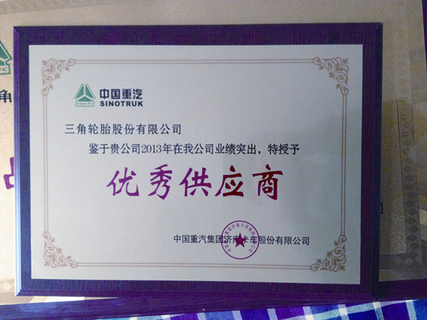 12月7日,中国重汽卡车股份2014年核心供应链商务大会在济南隆重召开。会上,三角轮胎股份有限公司被评为“优秀供应商”。图为获奖奖牌。