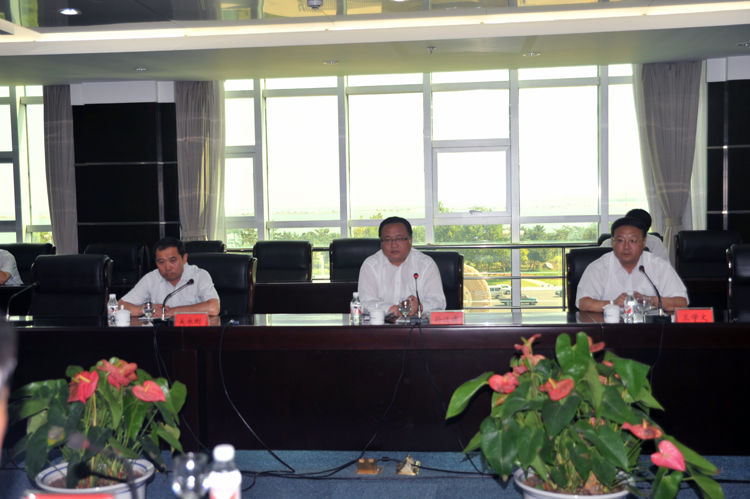 图为:孙述涛书记(中)在三角轮胎会议室听取汇报。