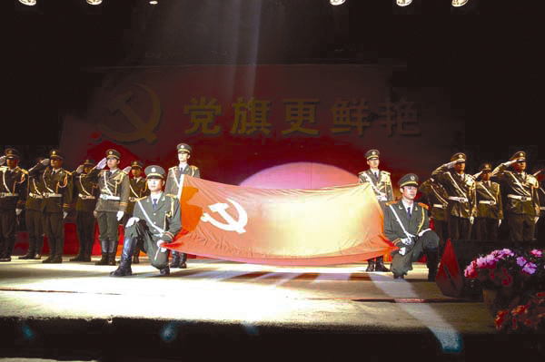 三角礼堂华灯璀璨,喜气洋洋。舞台正中,“党旗更鲜艳”5个金色大字在蓝天白云草地背景和红旗造型的映衬下熠熠生辉。18:30分,伴随着吉祥喜庆的音乐《欢乐的日子》,身着华装的三角艺术团演员们用柔美的身姿和激情力量的表演诠释着党领导国家和人民一路走来所凝结成的宏图美景和辉煌成就。