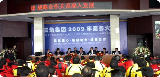三角集团董事长丁玉华在会上作了题为《坚定信念,树立雄心,把握好危机中的机会 变压力为动力,全面推进全球战略合作深入发展》的重要讲话。他回顾了一年来三角集团取得的成绩,分析了目前的形势,并就2009年的发展目标和实施措施向各合作伙伴和与会人员作了介绍。