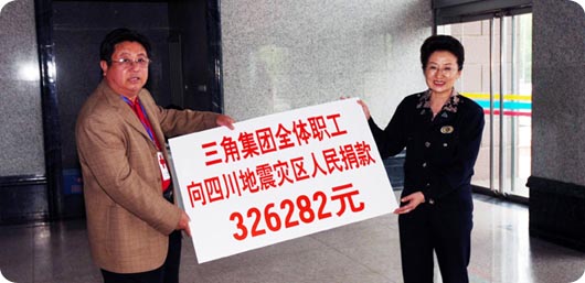 连日以来,三角集团全体干部员工纷纷慷慨解囊,向灾区人民奉献爱心。截止5月16日,三角集团干部员工向灾区人民捐款35.1075万元,捐助价值70万元的救援用卡客车轮胎450套。 5月13日,三角集团公司党委下发紧急倡议,号召全体三角干部员工“为灾区人民,献三角人爱心”。倡议书下发后,三角干部员工积极响应,公司从上到下,踊跃捐款。董事长丁玉华率先捐资,同时代表全体三角人向灾区捐助价值70余万无的救灾用轮胎450套。他向全体三角人号召说:善举不分先后,只要人人都献出一点爱,我们的爱心善举,也一定能够汇成爱的暖流,流进灾区群众的心田。让我们与灾区人民风雨同舟,心手相连,共渡难关!在岗的员工来了,在家休假的员工来了。公司信息中心一位身怀有孕、行动不便的女员工也不顾同事的劝说,非要将爱心亲自送到火红的捐助箱前……设在公司办公一楼的爱心捐助箱前,捐献爱心的人自发地排起长龙。在公司工作的外籍人员也加入到捐助行列。三角集团华通公司韩国籍经理徐廷吉在得知公司的募倡议后,当即捐款人民币1万元。三角集团华平公司职工丛艳玲在捐出100元后,在后来的捐款人群中,又出现了她的身影。当有人问起时才知道,原来她是受自己的父亲丛强滋委托,替老人来损献爱心的。丛强滋老人退休后身体不好,行动不便,连日来的灾情报道,让老人泪不能止。得知集团公司捐款的消息,老人当即拿400元,委托家人替他向灾区人民尽一份老三角人的心。 |