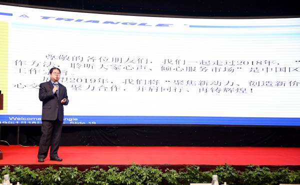 会议上,对2018年中国区市场运作情况进行回顾,对三角轮胎的全球化品牌建设情况做了总结,发布了2019年市场策略,商用车胎、乘用车胎、工程胎和巨胎等各产品线技术负责人做了新产品发布,会议表彰了在2018年市场营销方面取得突出成绩的合作伙伴。
