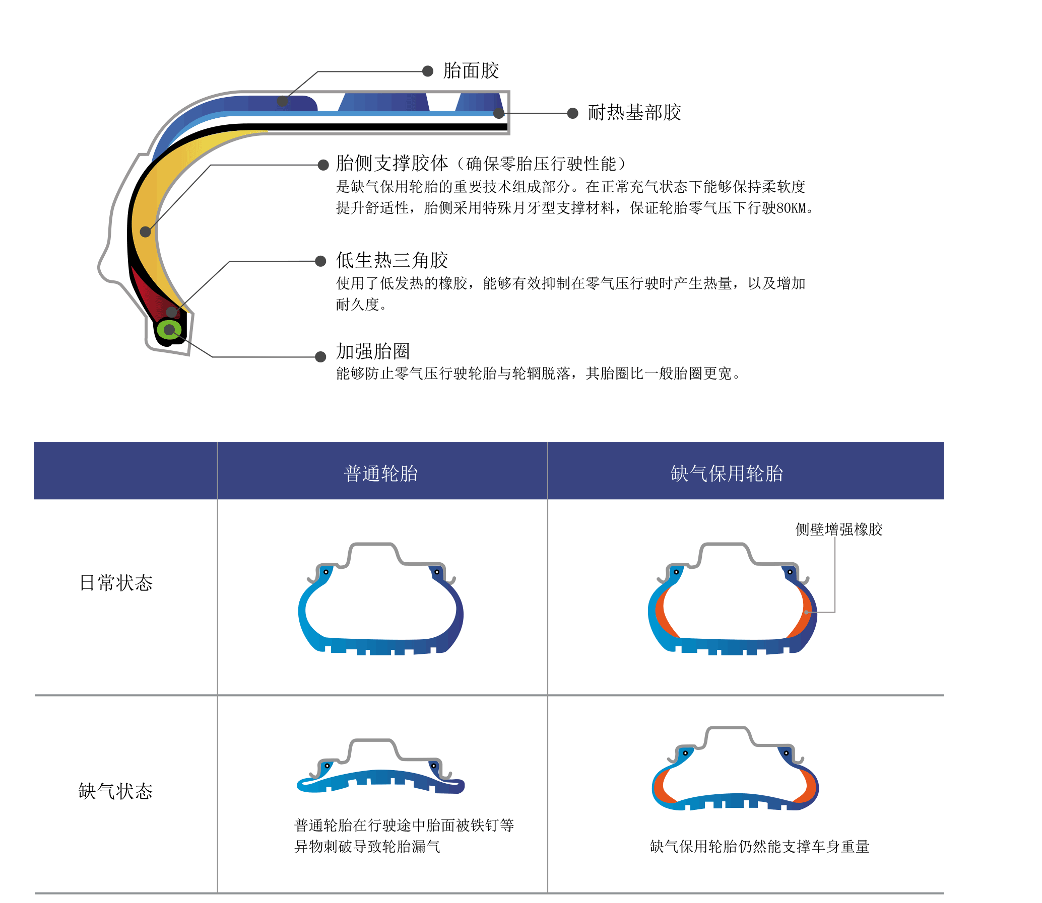 高强度、低生热、支撑胶设计, 胎侧采用特殊月牙型支撑材料,保证轮胎零气压下行驶80KM;