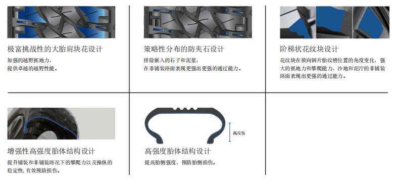采用功能聚合物与天然胶相结合的新型胎面胶 提高胎面的耐磨性 自洁能力以及承载力,多石块路况下具更出色的抓地力。