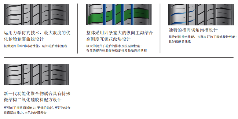 新一代功能化聚合物耦合具有特殊微结构二氧化硅胶料配方设计, 黑白双相补强材料、合适比例的含硅填料,抓地、滚阻及寿命达到完美平衡。