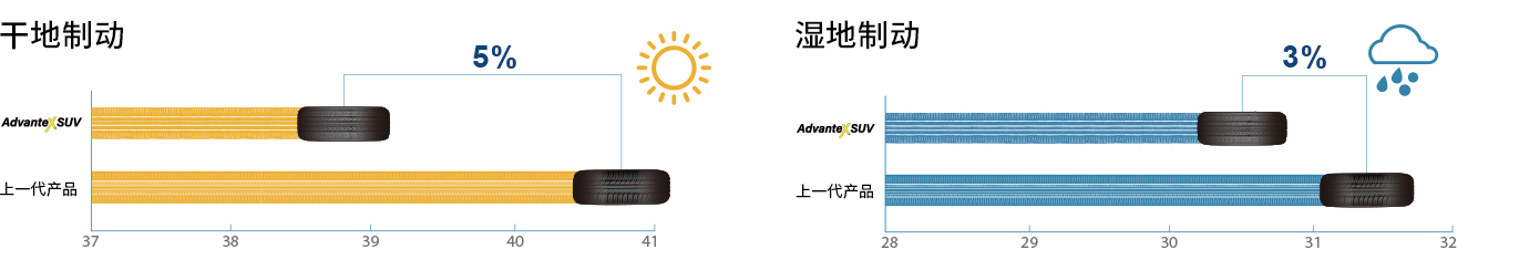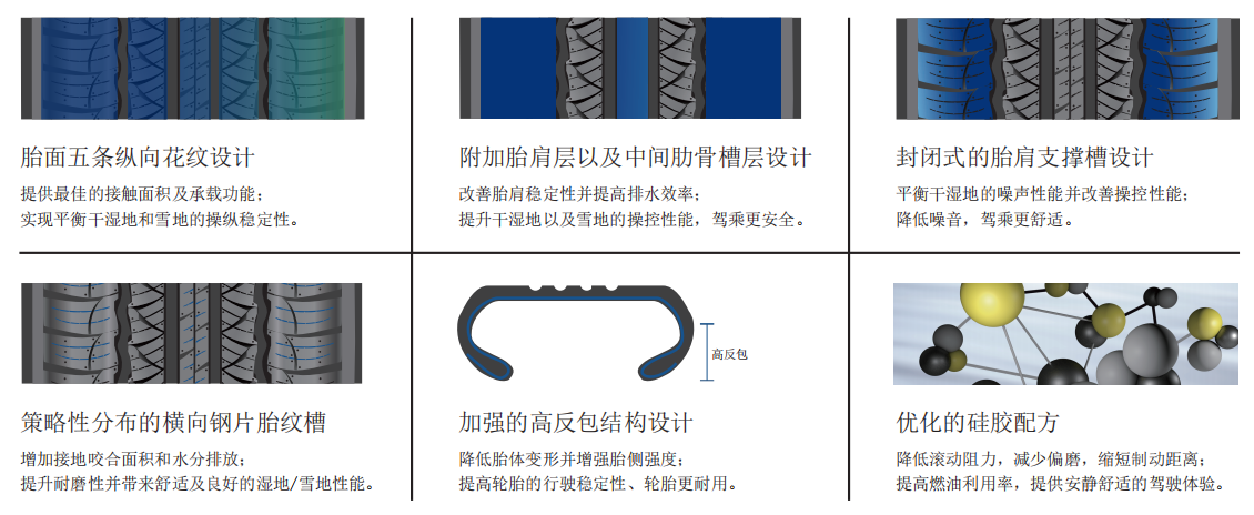 新一代高性能胎面胶配方设计, 具有高抓地力的同时,降低了轮胎滚动阻力;