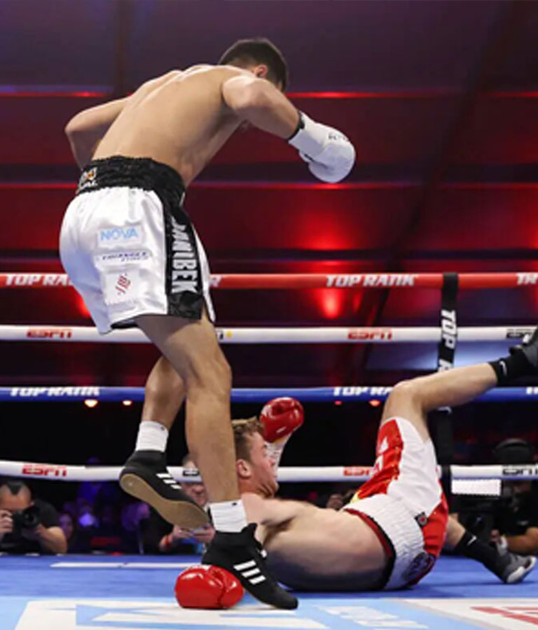 比赛的过程中,拳击手加尼别克·阿利姆哈充分展现力量和技术实力,多次重拳将对手击倒在地,最终赢得比赛。