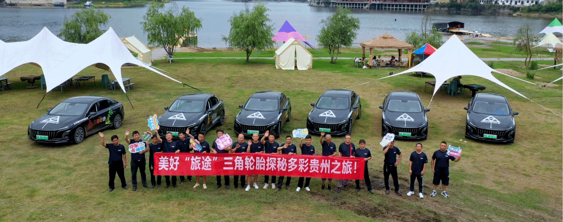 6月15日,旭日东升,朝霞宛如一片片燃烧的火焰,染红了半边天际,无比壮美。在贵阳市花果园“双子塔”停车场上,六辆国产新能源自驾车列队集结、整装待发。每辆车的车身都张贴绿色“旅途”字样、三角轮胎服务美好出行以及三角轮胎品牌LOGO,在阳光的照耀下闪耀而又夺目。早晨8点30分,全部装配三角“旅途”系列之“享旅”TH202花纹的6辆国产新能源自驾体验车,承载着来自贵州省30多家三角轮胎核心轮胎保门店的合作伙伴们,即将开启一场探秘多彩贵州之旅。大家精神振奋、心情愉悦,挥舞着手中各式美誉的展示手牌,面露微笑,充满憧憬的出发了……